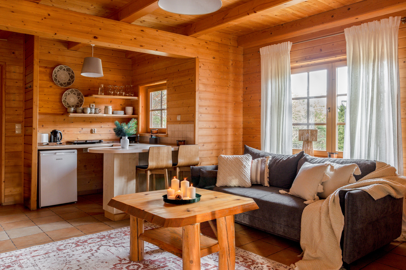 Posiadamy 5 w pełni wyposażonych całorocznych domków dwukondygnacyjnych o powierzchni 49m², przeznaczonych maksymalnie dla 9 osób. Położone są w urokliwym miejscu pośród drzew i zieleni.